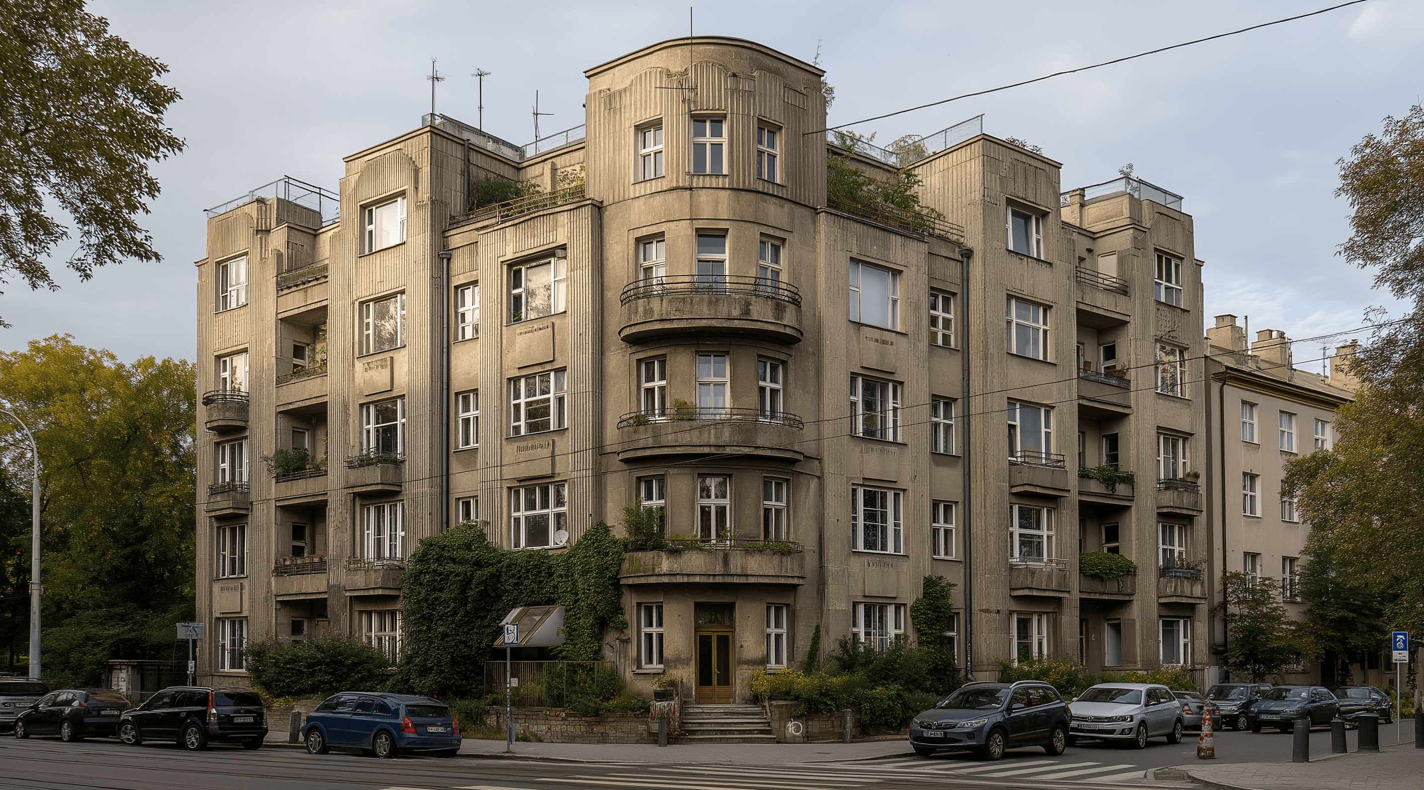 But they are there. Particularly in Mokotów, Żoliborz, and Śródmieście, clusters of 1920s and 1930s residential architecture remain — mostly apartment buildings, four to six storeys, with the proportions and ornamental restraint characteristic of Central European Modernism of that period. High ceilings, wide stair halls, parquet floors laid in herringbone or basketweave, cornices in the Polish vernacular of the period.